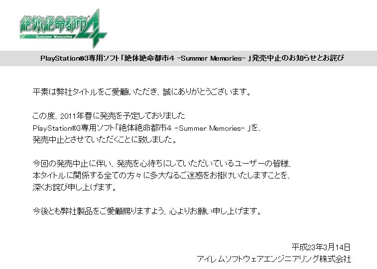 PlayStation?3ÀìÍÑ¥½¥Õ¥È¡ÖÀäÂÎÀäÌ¿ÅÔ»Ô£´ -Summer Memories- ¡×ȯÇäÃæ»ß¤Î¤ªÃΤ餻¤È¤ªÏͤÓ