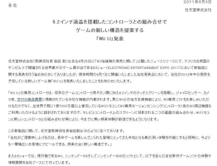ǤŷƲ³ô¼°²ñ¼Ò¡Ê¼èÄùÌò¼ÒĹ ´äÅÄ Áï¡Ë¤Ïµî¤ë4·î25Æü¤Ë¡ÖWii¸å·Ñµ¡¤ÎȯÇä¤Ë´Ø¤·¤Æ¡×¤ÈÂꤷ¤¿¥Ë¥å¡¼¥¹¥ê¥ê¡¼¥¹¤Ë¤Æ¡¢¥¢¥á¥ê¥«¹ç½°¹ñ¥í¥µ¥ó¥¼¥ë¥¹¤Ç³«ºÅ¤µ¤ì¤ëÀ¤³¦ºÇÂç¤Î¥²¡¼¥àŸ¼¨²ñ¤Ç ¤¢¤ëE3¥·¥ç¡¼¡ÊELECTRONIC ENTERTAINMENT EXPO 2011¡Ë¤Ë¤ª¤¤¤Æ¿·À½Éʤ˴ؤ¹¤ëȯɽ¤ò¹Ô¤¦»Ý¤ªÃΤ餻¤·¤Æ¤ª¤ê¤Þ¤·¤¿¤¬¡¢¸½ÃÏ»þ´Ö¤Î6·î7Æü¤Ë³«ºÅ¤¤¤¿¤·¤Þ¤·¤¿Åö¼Òȯɽ²ñ¤Ë¤ª¤¤¤Æ¡¢Åö¼Ò¤¬2012Ç¯Ãæ ¤ÎȯÇä¤òͽÄꤷ¤Æ¤¤¤ë¿·¤·¤¤¥²¡¼¥àµ¡¡ÖWii U¡×¤òȯɽ¤¤¤¿¤·¤Þ¤·¤¿¤³¤È¤ò¤ªÃΤ餻¤¤¤¿¤·¤Þ¤¹¡£
