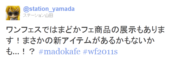 station_yamada ¥ï¥ó¥Õ¥§¥¹¤Ç¤Ï¤Þ¤É¤«¥Õ¥§¾¦ÉʤΟ¼¨¤â¤¢¤ê¤Þ¤¹¡ª¤Þ¤µ¤«¤Î¿·¥¢¥¤¥Æ¥à¤¬¤¢¤ë¤«¤â¤Ê¤¤¤«¤â¡Ä¡ª¡© #madokafe #wf2011s