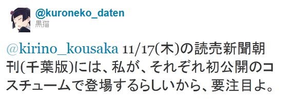https://twitter.com/#!/kuroneko_daten/status/135208209282641920@kirino_kousaka 11/17(ÌÚ)¤ÎÆÉÇ俷ʹī´©(ÀéÍÕÈÇ)¤Ë¤Ï¡¢»ä¤¬¡¢¤½¤ì¤¾¤ì½é¸ø³«¤Î¥³¥¹¥Á¥å¡¼¥à¤ÇÅо줹¤ë¤é¤·¤¤¤«¤é¡¢Í×ÃíÌܤ衣