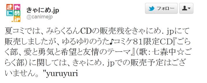 ²Æ¥³¥ß¤Ç¤Ï¡¢¤ß¤é¤¯¤ë¤óCD¤ÎÈÎÇä»Ä¤ò¤¤ã¤Ë¤á¡¥£ê£ð¤Ë¤ÆÈÎÇ䤷¤Þ¤·¤¿¤¬¡¢¤æ¤ë¤æ¤ê¤Î¤¦¤¿¢ö¥³¥ß¥±£¸£±¸ÂÄê£Ã£Ä¡Ø¤´¤é¤¯Éô¡¢°¦¤Èͦµ¤¤È´õ˾¤Èͧ¾ð¤Î¥Æ¡¼¥Þ¡Ù¡Ê²Î¡§¼·¿¹Ãæ¡ù¤´¤é¤¯Éô¡Ë¤Ë´Ø¤·¤Æ¤Ï¡¢¤¤ã¤Ë¤á¡¥£ê£ð¤Ç¤ÎÈÎÇäͽÄê¤Ï¤´¤¶¤¤¤Þ¤»¤ó¡£
