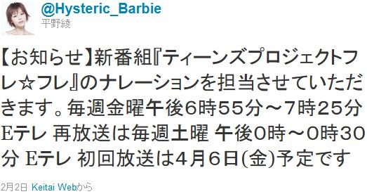 4·î¤«¤éE¥Æ¥ì¤Ç¥¹¥¿¡¼¥È¤¹¤ë¿·ÈÖÁȡ֥ƥ£¡¼¥ó¥º¥×¥í¥¸¥§¥¯¥È¥Õ¥ì¡ù¥Õ¥ì¡×¤Î¥Ê¥ì¡¼¥·¥ç¥ó¤ò¡¢Ê¿Ìî°½¤µ¤ó¤¬Ã´Åö¤¹¤ë¡£