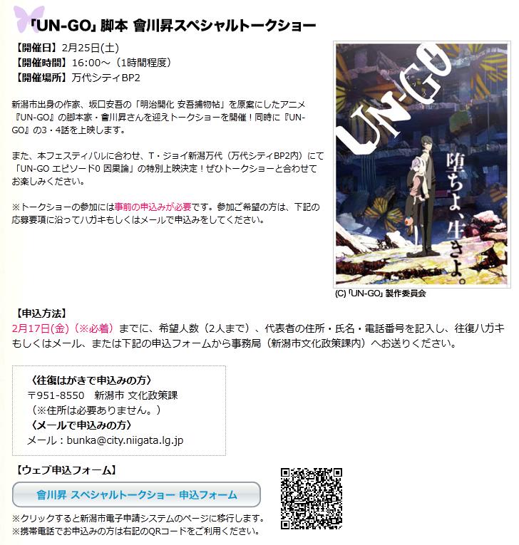 ¢¨25Æü(ÅÚ)¤Ï¡¢¥¢¥Ë¥á¡ÖUN-GO¡×µÓËÜ ÐòÀ¥¹¥Ú¥·¥ã¥ë¥È¡¼¥¯¥·¥ç¡¼¤ÎÁ°¸å¤Ç¾å±ÇͽÄê¤Ç¤¹¡£¥È¡¼¥¯¥·¥ç¡¼¤Î»þ´Ö¤È¤ÏÈï¤ê¤Þ¤»¤ó¤Î¤ÇξÊý¤ª³Ú¤·¤ß¤¤¤¿¤À¤±¤Þ¤¹¡£