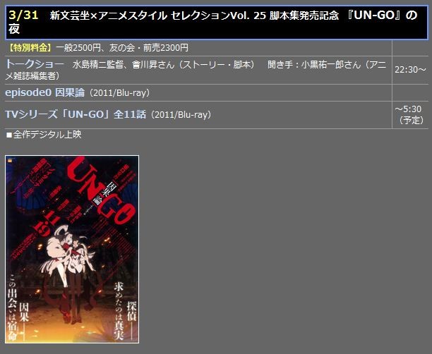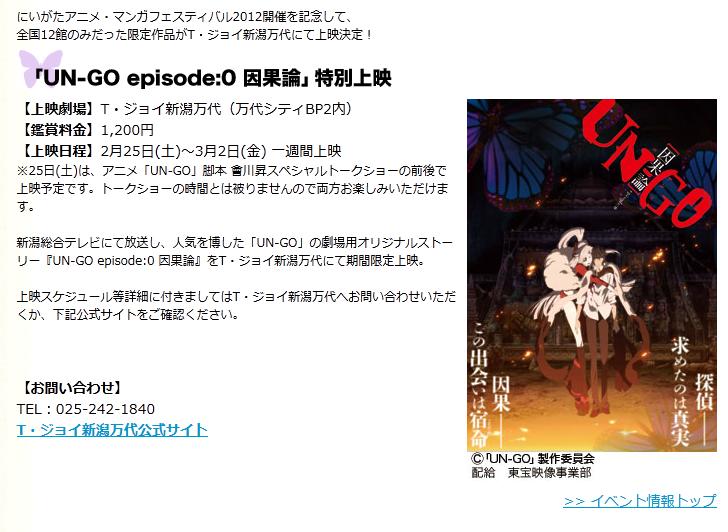 ʸ¹ë¡¦ºä¸ý°Â¸ã¤Î¡ÖÌÀ¼£³«²½¡¡°Â¸ãÊáʪġ¡×¤òÂçÃÀ¤ËËݰƤ·¡¢ÏÃÂê¤ò¸Æ¤ó¤À¡ØUN-GO¡Ù¤¬¥¹¥¯¥ê¡¼¥ó¤Ëµ¢¤Ã¤Æ¤¯¤ë¡££Ô£Ö¥·¥ê¡¼¥ºÁ´11Ïäˡ¢Á°Æüëý¤òÊü±ÇÃæ¤Ë¥¹¥¯¥ê¡¼¥ó¤Ç¾å±Ç¤·¡¢Ï¢ÆüÂçÆþ¤ê¤È¤Ê¤Ã¤¿¡Øepisode:0¡¡°ø²ÌÏÀ¡Ù¤ò¹ç¤ï¤»¡¢¥ª¡¼¥ë¥Ê¥¤¥È¤Ç°ìµó¾å±Ç¤¹¤ë¡£¡ØUN-GO¡Ù¤ÎÁ´ËƤòÇİ®¤¹¤ë¡¢Àä¹¥¤Îµ¡²ñ¤È¤Ê¤ë¤À¤í¤¦¡£¤Ê¤ª¡¢Á´¤ÆBlu-ray¤Ç¤Î¾å±Ç¤È¤Ê¤ë¡£Æü»þ¤Ï£³·î31Æü¡¢¾ì½ê¤ÏÃÓÂÞ¡¦¿·Ê¸·ÝºÁ¡£¾å±Ç¤ËÀè¤À¤Ã¤Æ¹Ô¤ï¤ì¤ë¥È¡¼¥¯¤Ë¤Ï¡¢´ÆÆÄ¤Î¿åÅçÀºÆó¤È¥¹¥È¡¼¥ê¡¼¡¦µÓËܤÎÐòÀ¤¬ÅÐÃÅͽÄê¡£Á°Çä¤ê¥Á¥±¥Ã¥È¤Ï¡¢¿·Ê¸·ÝºÁ¤Ë¤ÆÈ¯ÇäÃæ¡£¥Á¥±¥Ã¥È¤Ô¤¢¤Ç¤â¡¢14Æü¤«¤éȯÇ䤹¤ëͽÄê¤À¡£¾Ü¤·¤¯¤Ï¡¢¿·Ê¸·ÝºÁ¤Î¾å±Ç¹ðÃÎ¥Ú¡¼¥¸¤Ç³Îǧ¤·¤Æ¤Û¤·¤¤¡£