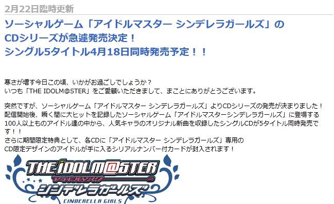 ÆÍÁ³¤Ç¤¹¤¬¡¢¥½¡¼¥·¥ã¥ë¥²¡¼¥à¡Ö¥¢¥¤¥É¥ë¥Þ¥¹¥¿¡¼ ¥·¥ó¥Ç¥ì¥é¥¬¡¼¥ë¥º¡×¤è¤êCD¥·¥ê¡¼¥º¤ÎȯÇ䤬·è¤Þ¤ê¤Þ¤·¤¿¡ªÇÛ¿®³«»Ï¸å¡¢½Ö¤¯´Ö¤ËÂç¥Ò¥Ã¥È¤òµÏ¿¤·¤¿¥½¡¼¥·¥ã¥ë¥²¡¼¥à¡Ö¥¢¥¤¥É¥ë¥Þ¥¹¥¿¡¼¥·¥ó¥Ç¥ì¥é¥¬¡¼¥ë¥º¡×¤ËÅо줹¤ë100¿Í°Ê¾å¤â¤Î¥¢¥¤¥É¥ëã¤ÎÃæ¤«¤é¡¢¿Íµ¤¥¥ã¥é¤Î¥ª¥ê¥¸¥Ê¥ë¿·¶Ê¤ò¼ýÏ¿¤·¤¿¥·¥ó¥°¥ëCD¤¬5¥¿¥¤¥È¥ëƱ»þȯÇä¤Ç¤¹¡ª¡ª¤µ¤é¤Ë´ü´Ö¸ÂÄêÆÃŵ¤È¤·¤Æ¡¢³ÆCD¤Ë¡Ö¥¢¥¤¥É¥ë¥Þ¥¹¥¿¡¼ ¥·¥ó¥Ç¥ì¥é¥¬¡¼¥ë¥º¡×ÀìÍѤÎCD¸ÂÄê¥Ç¥¶¥¤¥ó¤Î¥¢¥¤¥É¥ë¤¬¼ê¤ËÆþ¤ë¥·¥ê¥¢¥ë¥Ê¥ó¥Ð¡¼ÉÕ¥«¡¼¥É¤¬ÉõÆþ¤µ¤ì¤Þ¤¹¡ª