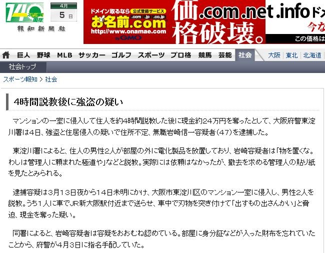 ÂáÊáÍÆµ¿¤Ï£³·î£±£³ÆüÌ뤫¤é£±£´Æṳ̈ÌÀ¤Ë¤«¤±¡¢Âçºå»ÔÅìÍäÀî¶è¤Î¥Þ¥ó¥·¥ç¥ó°ì¼¼¤Ë¿¯Æþ¤·¡¢ÃËÀ£²¿Í¤òÀâ¶µ¡£¤¦¤Á£±¿Í¤Ë¼Ö¤Ç£Ê£Ò¿·Âçºå±ØÉÕ¶á¤Þ¤ÇÁ÷¤é¤»¡¢¼ÖÃæ¤Ç¿Ïʪ¤òÆÍ¤ÉÕ¤±¤Æ¡Ö½Ð¤¹¤â¤Î½Ð¤µ¤ó¤«¤¤¡×¤È¶¼Ç÷¡¢¸½¶â¤òÃ¥¤Ã¤¿µ¿¤¤¡£
