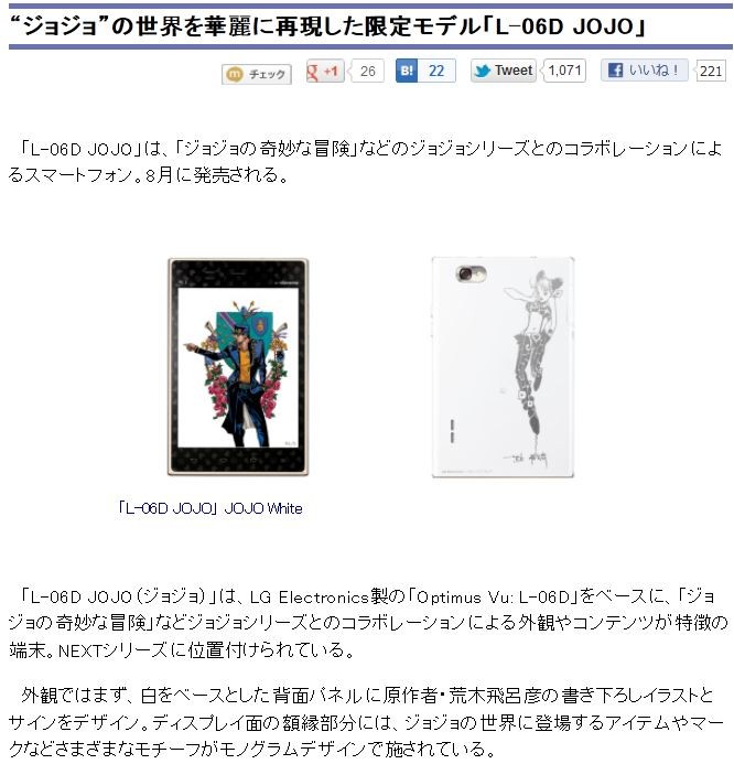 ¡Ø¥¸¥ç¥¸¥ç¤Î´ñ̯¤ÊËÁ¸±¡Ù¤È¥³¥é¥Ü¥¹¥Þ¡¼¥È¥Õ¥©¥ó¡ØOptimus Vu:L-06D JOJO¡Ù8·îȯÇäͽÄê