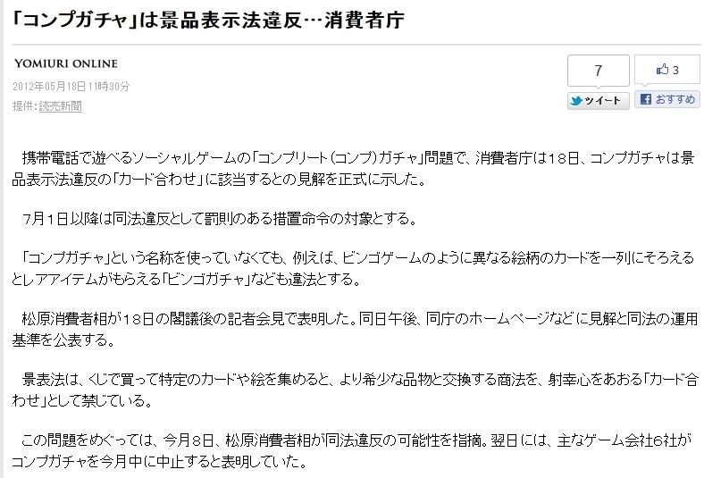 ¤³¤ÎÌäÂê¤ò¤á¤°¤Ã¤Æ¤Ï¡¢º£·î£¸Æü¡¢¾¾¸¶¾ÃÈñ¼ÔÁ꤬Ʊˡ°ãÈ¿¤Î²ÄǽÀ¤ò»ØÅ¦¡£ÍâÆü¤Ë¤Ï¡¢¼ç¤Ê¥²¡¼¥à²ñ¼Ò£¶¼Ò¤¬¥³¥ó¥×¥¬¥Á¥ã¤òº£·îÃæ¤ËÃæ»ß¤¹¤ë¤ÈɽÌÀ¤·¤Æ¤¤¤¿¡£