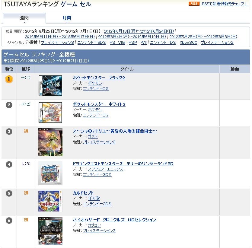 ¡ÚTSUTAYA¥²¡¼¥à¥é¥ó¥¥ó¥°¡Û¥È¥Ã¥×¤ÏDS¡Ø¥Ý¥±¥â¥óB&W 2¡Ù¡¢3°Ì¤ËPS3¡Ø¥¢¡¼¥·¥ã¤Î¥¢¥È¥ê¥¨¡Ù