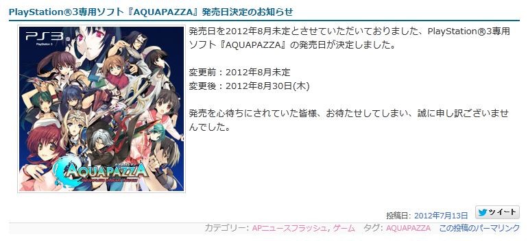 ȯÇäÆü¤ò2012ǯ8·î̤Äê¤È¤µ¤»¤Æ¤¤¤¿¤À¤¤¤Æ¤ª¤ê¤Þ¤·¤¿¡¢PlayStationR3ÀìÍÑ¥½¥Õ¥È¡ØAQUAPAZZA¡Ù¤ÎȯÇäÆü¤¬·èÄꤷ¤Þ¤·¤¿¡£