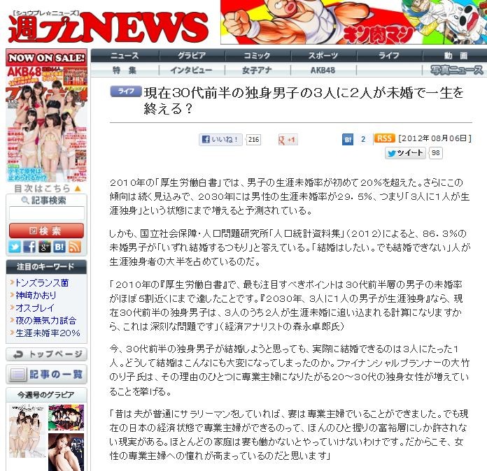 ¡Ö£²£°£±£°Ç¯¤Î¡Ø¸üÀ¸Ï«Æ¯Çò½ñ¡Ù¤Ç¡¢ºÇ¤âÃíÌܤ¹¤Ù¤¥Ý¥¤¥ó¥È¤Ï£³£°ÂåÁ°È¾ÁؤÎÃ˻ҤÎ̤º§Î¨¤¬¤Û¤Ü£µ³ä¶á¤¯¤Ë¤Þ¤Ç㤷¤¿¤³¤È¤Ç¤¹¡£¡Ø£²£°£³£°Ç¯¡¢£³¿Í¤Ë£±¿Í¤ÎÃ˻Ҥ¬À¸³¶ÆÈ¿È¡Ù¤Ê¤é¡¢¸½ºß£³£°ÂåÁ°È¾¤ÎÆÈ¿ÈÃ˻Ҥϡ¢£³¿Í¤Î¤¦¤Á£²¿Í¤¬À¸³¶Ì¤º§¤ËÄɤ¤¹þ¤Þ¤ì¤ë·×»»¤Ë¤Ê¤ê¤Þ¤¹¤«¤é¡¢¤³¤ì¤Ï¿¼¹ï¤ÊÌäÂê¤Ç¤¹¡×¡Ê·ÐºÑ¥¢¥Ê¥ê¥¹¥È¤Î¿¹±ÊÂîϺ»á¡Ë