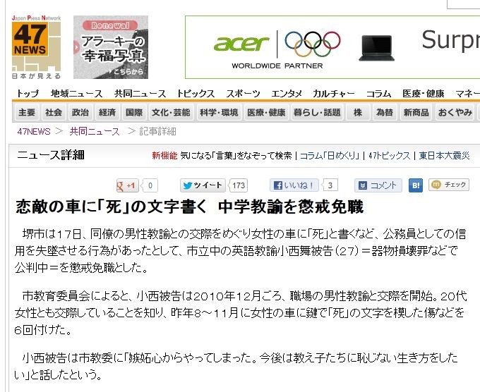 ºæ»Ô¤Ï£±£·Æü¡¢Æ±Î½¤ÎÃËÀ¶µÍ¡¤È¤Î¸òºÝ¤ò¤á¤°¤ê½÷À¤Î¼Ö¤Ë¡Ö»à¡×¤È½ñ¤¯¤Ê¤É¡¢¸øÌ³°÷¤È¤·¤Æ¤Î¿®ÍѤò¼ºÄƤµ¤»¤ë¹Ô°Ù¤¬¤¢¤Ã¤¿¤È¤·¤Æ¡¢»ÔÎ©Ãæ¤Î±Ñ¸ì¶µÍ¡¾®À¾ÉñÈï¹ð¡Ê£²£·¡Ë¡á´ïʪ»²õºá¤Ê¤É¤Ç¸øÈ½Ãæ¡á¤òĨ²üÌÈ¿¦¤È¤·¤¿¡£