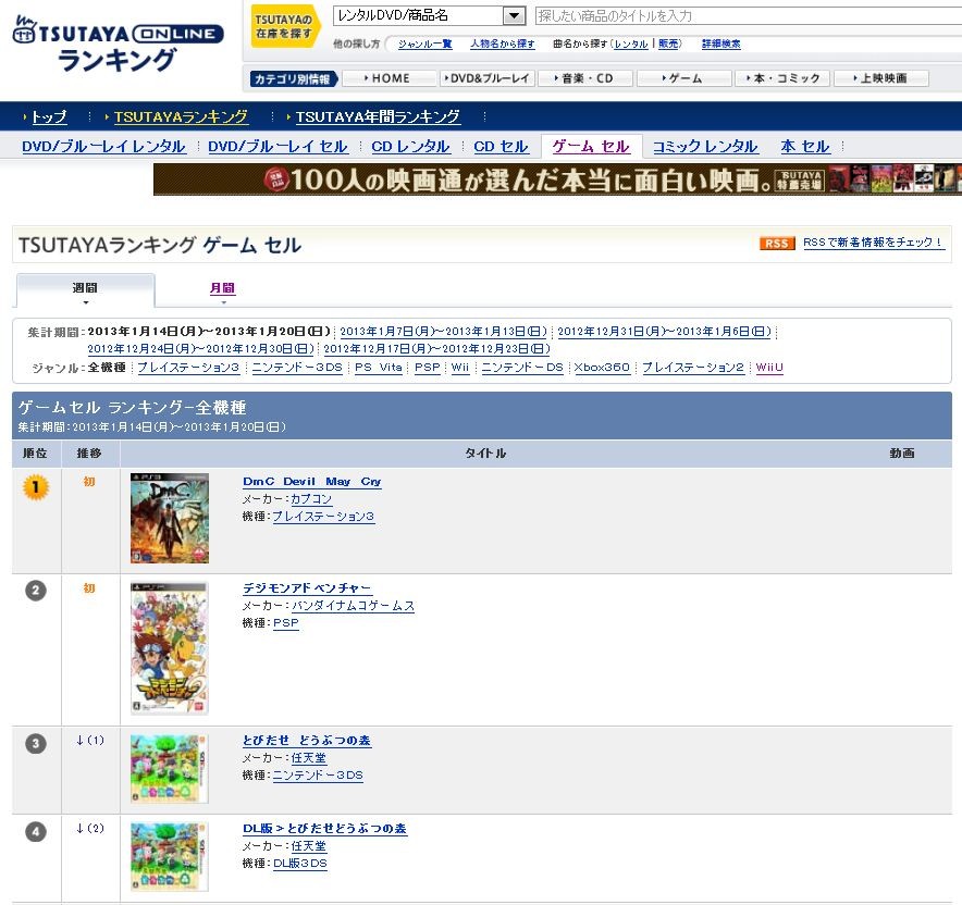 ¡ÚTSUTAYA¥²¡¼¥à¥¦¥£¡¼¥¯¥ê¡¼¡Û1°ÌPS3¡ØDmC ¥Ç¥Ó¥ë¥á¥¤¥¯¥é¥¤¡Ù¡¢2°ÌPSP¡Ø¥Ç¥¸¥â¥ó¥¢¥É¥Ù¥ó¥Á¥ã¡¼¡Ù¡¢3°Ì3DS¡Ø¤È¤Ó¤À¤» ¤É¤¦¤Ö¤Ä¤Î¿¹¡Ù