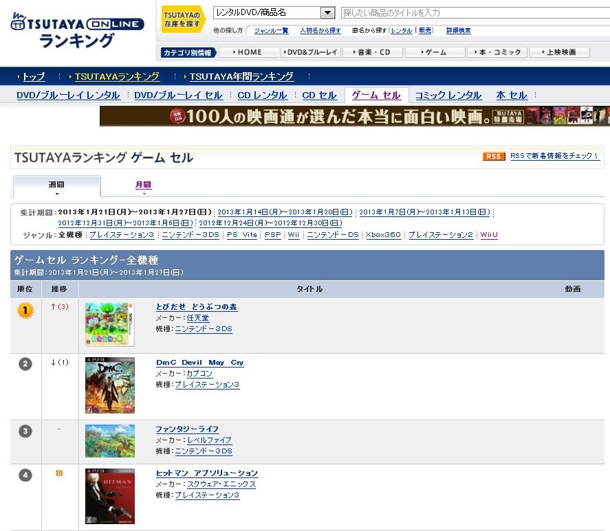 ¡ÚTSUTAYA¥²¡¼¥àÇä¾å¡Û1°Ì3DS¡Ø¤È¤Ó¤À¤» ¤É¤¦¤Ö¤Ä¤Î¿¹¡Ù¡¢2°ÌPS3¡ØDmC ¥Ç¥Ó¥ë¥á¥¤¥¯¥é¥¤¡Ù¡¢3°Ì3DS¡Ø¥Õ¥¡¥ó¥¿¥¸¡¼¥é¥¤¥Õ¡Ù¡¢¿·ºî¤Ï4°Ì°Ê²¼¤Ë