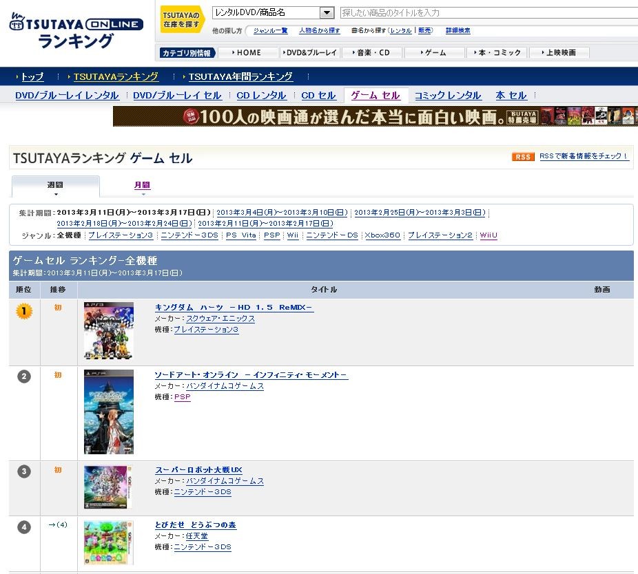¡ÚTSUTAYA¥²¡¼¥à¥¦¥£¡¼¥¯¥ê¡¼¡Û1°ÌPS3¡Ø¥¥ó¥°¥À¥à¥Ï¡¼¥Ä HD1.5 ReMIX¡Ù¡¢2°ÌPSP¡Ø¥½¡¼¥É¥¢¡¼¥È¥ª¥ó¥é¥¤¥ó¡Ù¡¢3°Ì¡Ø¥¹¡¼¥Ñ¡¼¥í¥Ü¥Ã¥ÈÂçÀïUX¡Ù