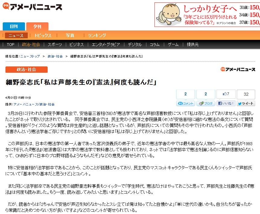3·î29Æü¤Ë¹Ô¤ï¤ì¤¿»²±¡Í½»»°Ñ°÷²ñ¤Ç¡¢°ÂÇÜ¿¸»°¼óÁê¡Ê58¡Ë¤¬·ûË¡³Ø¤Ç¹â̾¤Ê°²Éô¿®´î¶µ¼ø¤Ë¤Ä¤¤¤Æ¡Ö»ä¤Ï¸¤¸¾å¤²¤Æ¤ª¤ê¤Þ¤»¤ó¡×¤È²óÅú¤·¤¿¤³¤È¤¬¥Í¥Ã¥È¤Ç¼è¤êº»ÂÁ¤µ¤ì¤Æ¤¤¤ë¡£ ¡¡Æ±Í½»»°Ñ°÷²ñ¤Ç¤Ï¡¢Ì±¼çÅޤξ®À¾ÍÎÇ·»²±¡µÄ°÷¡Ê41¡Ë¤¬°ÂÇܼóÁê¤ËºÙ¤«¤Ê·ûË¡¤Î¾òʸ¤Ë¤Ä¤¤¤Æ¼ÁÌä¡£°ÂÇܼóÁ꤬¡Ö¥¯¥¤¥º¤Î¤è¤¦¤Ê¼ÁÌä¤ÏÈóÀ¸»ºÅª¡×¤ÈÊÖ¤·ÏÃÂê¤È¤Ê¤Ã¤Æ¤¤¤ë¤¬¡¢°²Éô»á¤Ë¤Ä¤¤¤Æ¤Î¼ÁÌä¤â¤½¤ÎÃæ¤Ç¹Ô¤ï¤ì¤¿¤â¤Î¡£¾®À¾»á¤Î¡Ö°²Éô¿®´î¤µ¤ó¤È¤¤¤¦·ûË¡³Ø¼Ô¤´Â¸¤¸¤Ç¤¹¤«¡×¤È¤ÎÌ䤤¤Ë°ÂÇܼóÁê¤Ï¡Ö»ä¤Ï¸¤¸¾å¤²¤Æ¤ª¤ê¤Þ¤»¤ó¡×¤È²óÅú¤·¤¿¡£