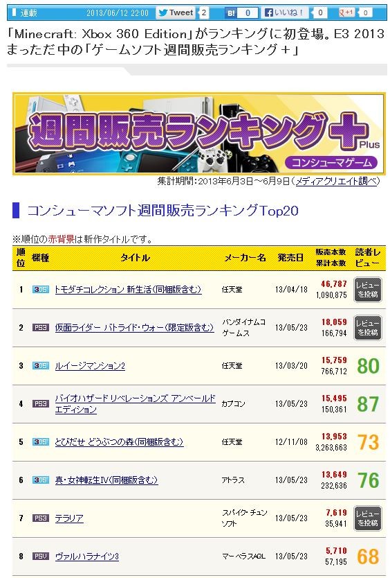 1°Ì3DS¡Ø¥È¥â¥À¥Á¥³¥ì¥¯¥·¥ç¥ó ¿·À¸³è¡Ù¡¢¿·ºî¤Ï360¡Ø¥Þ¥¤¥ó¥¯¥é¥Õ¥È Xbox360EDITION¡Ù¤¬¥é¥ó¥¯¥¤¥ó¡Ú2013/06/19ÉÕ¤± ¥²¡¼¥à¥¦¥£¡¼¥¯¥ê¡¼¡Û