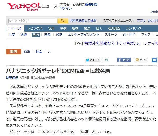̱ˡ³Æ¶É¡¢¥Ñ¥Ê¥½¥Ë¥Ã¥¯¿··¿¥Æ¥ì¥Ó¤ÎCMÊüÁ÷µñÈÝ¡¢¥Í¥Ã¥È¤Ë»ëݼԤ¬¤È¤é¤ì¤½¤¦¤Ê¤Î¤¬ÌäÂê¤Ë