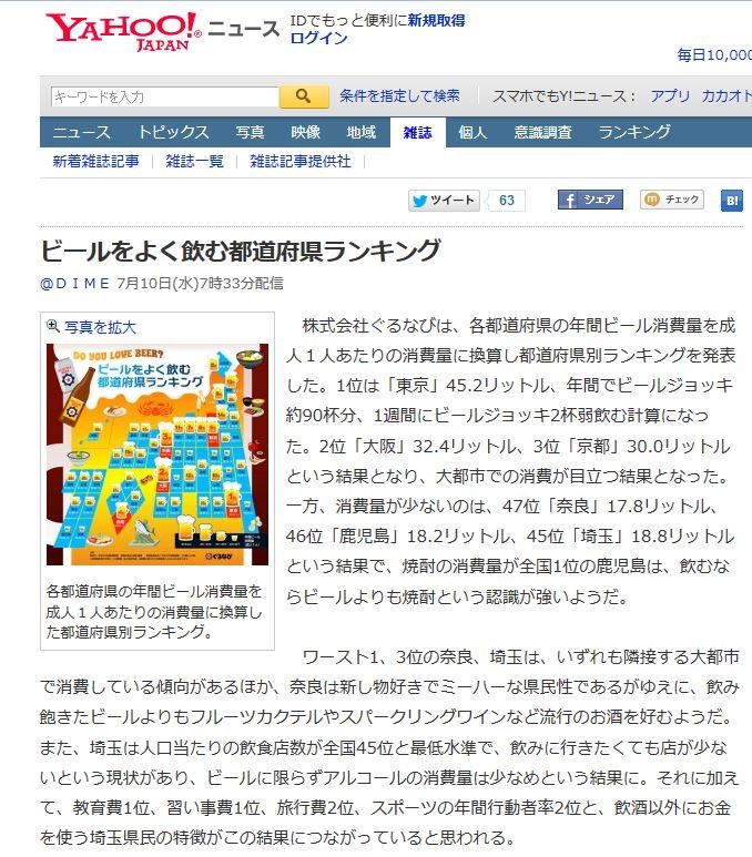 ³ô¼°²ñ¼Ò¤°¤ë¤Ê¤Ó¤Ï¡¢³ÆÅÔÆ»Éܸ©¤Îǯ´Ö¥Ó¡¼¥ë¾ÃÈñÎ̤òÀ®¿Í£±¿Í¤¢¤¿¤ê¤Î¾ÃÈñÎ̤˴¹»»¤·ÅÔÆ»Éܸ©ÊÌ¥é¥ó¥¥ó¥°¤òȯɽ¤·¤¿¡£1°Ì¤Ï¡ÖÅìµþ¡×45.2¥ê¥Ã¥È¥ë¡¢Ç¯´Ö¤Ç¥Ó¡¼¥ë¥¸¥ç¥Ã¥Ìó90ÇÕʬ¡¢1½µ´Ö¤Ë¥Ó¡¼¥ë¥¸¥ç¥Ã¥2ÇÕ¼å°û¤à·×»»¤Ë¤Ê¤Ã¤¿¡£2°Ì¡ÖÂçºå¡×32.4¥ê¥Ã¥È¥ë¡¢3°Ì¡ÖµþÅÔ¡×30.0¥ê¥Ã¥È¥ë¤È¤¤¤¦·ë²Ì¤È¤Ê¤ê¡¢ÂçÅԻԤǤξÃÈñ¤¬ÌÜΩ¤Ä·ë²Ì¤È¤Ê¤Ã¤¿¡£°ìÊý¡¢¾ÃÈñÎ̤¬¾¯¤Ê¤¤¤Î¤Ï¡¢47°Ì¡ÖÆàÎÉ¡×17.8¥ê¥Ã¥È¥ë¡¢46°Ì¡Ö¼¯»ùÅç¡×18.2¥ê¥Ã¥È¥ë¡¢45°Ì¡Öºë¶Ì¡×18.8¥ê¥Ã¥È¥ë¤È¤¤¤¦·ë²Ì¤Ç¡¢¾ÆÃñ¤Î¾ÃÈñÎ̤¬Á´¹ñ1°Ì¤Î¼¯»ùÅç¤Ï¡¢°û¤à¤Ê¤é¥Ó¡¼¥ë¤è¤ê¤â¾ÆÃñ¤È¤¤¤¦Ç§¼±¤¬¶¯¤¤¤è¤¦¤À¡£