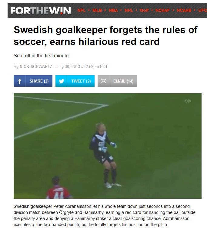 http://ftw.usatoday.com/2013/07/swedish-goalkeeper-forgets-the-rules-of-soccer-earns-hilarious-red-card/