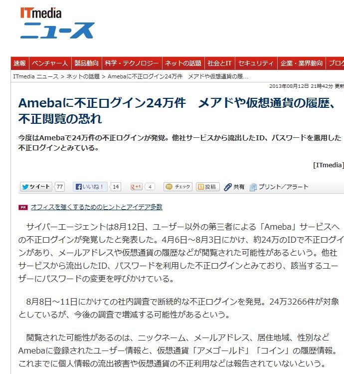 º£ÅÙ¤ÏAmeba¤Ç24Ëü·ï¤ÎÉÔÀµ¥í¥°¥¤¥ó¤¬È¯³Ð¡£Â¾¼Ò¥µ¡¼¥Ó¥¹¤«¤éή½Ð¤·¤¿ID¡¢¥Ñ¥¹¥ï¡¼¥É¤ò°ÍѤ·¤¿ÉÔÀµ¥í¥°¥¤¥ó¤È¤ß¤Æ¤¤¤ë¡£