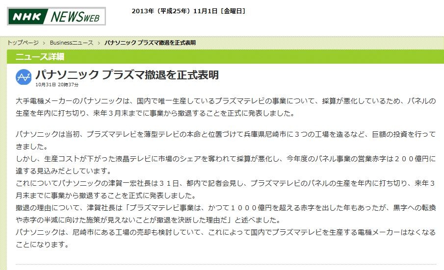 Âç¼êÅŵ¡¥á¡¼¥«¡¼¤Î¥Ñ¥Ê¥½¥Ë¥Ã¥¯¤Ï¡¢¹ñÆâ¤ÇÍ£°ìÀ¸»º¤·¤Æ¤¤¤ë¥×¥é¥º¥Þ¥Æ¥ì¥Ó¤Î»ö¶È¤Ë¤Ä¤¤¤Æ¡¢ºÎ»»¤¬°²½¤·¤Æ¤¤¤ë¤¿¤á¡¢¥Ñ¥Í¥ë¤ÎÀ¸»º¤òǯÆâ¤ËÂǤÁÀڤꡢÍèǯ£³·îËö¤Þ¤Ç¤Ë»ö¶È¤«¤éűÂह¤ë¤³¤È¤òÀµ¼°¤Ëȯɽ¤·¤Þ¤·¤¿¡£