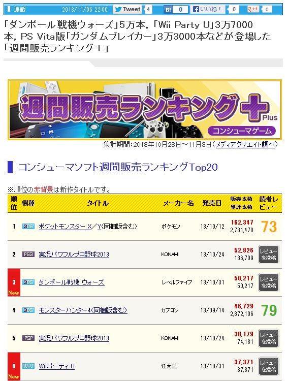 ¡Ö¥À¥ó¥Ü¡¼¥ëÀﵡ¥¦¥©¡¼¥º¡×5ËüËÜ¡¤¡ÖWii Party U¡×3Ëü7000ËÜ¡¤PS VitaÈǡ֥¬¥ó¥À¥à¥Ö¥ì¥¤¥«¡¼¡×3Ëü3000Ëܤʤɤ¬Åо줷¤¿¡Ö½µ´ÖÈÎÇä¥é¥ó¥¥ó¥°¡Ü¡×