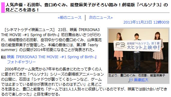23Æü¡¢±Ç²è¡ØPERSONA3 THE MOVIE -#1 Spring of Birth-¡Ù½éÆüÉñÂæ¤¢¤¤¤µ¤Ä¤¬¹Ô¤ï¤ì¡¢·ë¾ëÍýÌò¤ÎÀÐÅľ´¡¢³Ù±©¤æ¤«¤êÌò¤Î˸ý¤á¤°¤ß¡¢»³´ßÉ÷²ÖÌò¤ÎǽÅÐËãÈþ»Ò¤¬ÅÐÃŤ·¤¿¡£ËÜÊԤκǸå¤Ë¤Ï¡¢Âè2¾Ï¡Öearly summer¡×¤Î¸ø³«¤¬2014ǯ½é²Æ¤Ë¤Ê¤ë¤³¤È¤¬È¯É½¤µ¤ì¤¿¡£