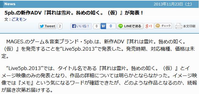 MAGES.¤Î¥²¡¼¥à¡õ²»³Ú¥Ö¥é¥ó¥É¡¦5pb.¤Ï¡¢¿·ºîADV¡ØÂ¶¤ì¤ÏÀãÊÒ¡£Òë¤á¤ÎÇ¡¤¯¡£¡Ê²¾¡Ë¡Ù¤òȯÇ䤹¤ë¤³¤È¤ò¡ÈLive5pb.2013¡É¤Çȯɽ¤·¤¿¡£È¯Çä»þ´ü¡¢Âбþµ¡¼ï¡¢²Á³Ê¤Ï̤Äê¡£