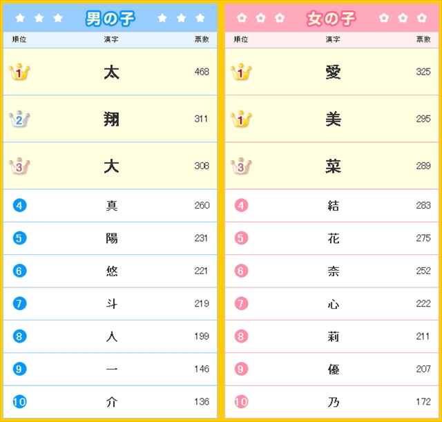 »È¤ï¤ì¤¿´Á»ú¤Ï¡¢ÃˤλҤÎ1°Ì¤Ï¡ÖÂÀ¡×¤Î468ɼ¡£°Ê²¼¡ÖæÆ¡×(311ɼ)¡¢¡ÖÂç¡×(308ɼ)¡¢¡Ö¿¿¡×(260ɼ)¡¢¡ÖÍÛ¡×(231ɼ)¤È¤Ê¤Ã¤¿¡£