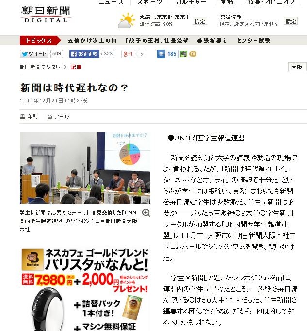 ¡Ö¿·Ê¹¤òÆÉ¤â¤¦¡×¤ÈÂç³Ø¤Î¹ÖµÁ¤ä½¢³è¤Î¸½¾ì¤Ç¤è¤¯¸À¤ï¤ì¤ë¡£¤À¤¬¡¢¡Ö¿·Ê¹¤Ï»þÂåÃÙ¤ì¡×¡Ö¥¤¥ó¥¿¡¼¥Í¥Ã¥È¤Ê¤É¥ª¥ó¥é¥¤¥ó¤Î¾ðÊó¤Ç½½Ê¬¤À¡×¤È¤¤¤¦À¼¤¬³ØÀ¸¤Ë¤Ïº¬¶¯¤¤¡£¼ÂºÝ¡¢¤Þ¤ï¤ê¤Ç¤â¿·Ê¹¤òËèÆüÆÉ¤à³ØÀ¸¤Ï¾¯¿ôÇɤÀ¡£³ØÀ¸¤Ë¿·Ê¹¤ÏɬÍפ«¡½¡½¡£»ä¤¿¤Áµþºå¿À¤Î£¹Âç³Ø¤Î³ØÀ¸¿·Ê¹¥µ¡¼¥¯¥ë¤¬²ÃÌÁ¤¹¤ë¡Ö£Õ£Î£Î´ØÀ¾³ØÀ¸ÊóƻϢÌÁ¡×¤Ï£±£±·îËö¡¢Âçºå»Ô¤ÎÄ«Æü¿·Ê¹ÂçºåËܼҥ¢¥µ¥³¥à¥Û¡¼¥ë¤Ç¥·¥ó¥Ý¥¸¥¦¥à¤ò³«¤¡¢Ì䤤¤«¤±¤¿¡£